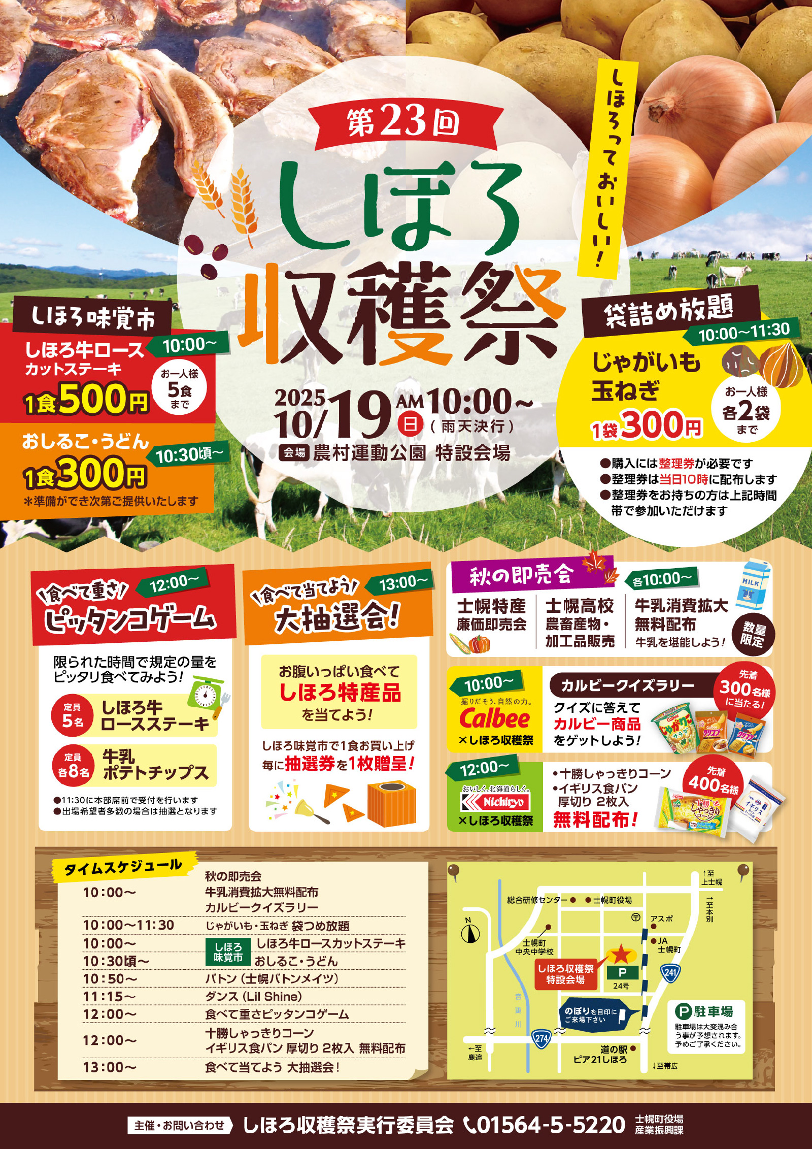 本町特産品の販売をはじめ、しほろ味覚市(しほろ牛ロースカットステーキ・おしるこ・うどん)や袋つめ放題(じゃがいも・玉ねぎ)など士幌の秋の味覚を堪能してください。 また、「食べて重さピッタンコゲーム」や「抽選会」などのイ […]